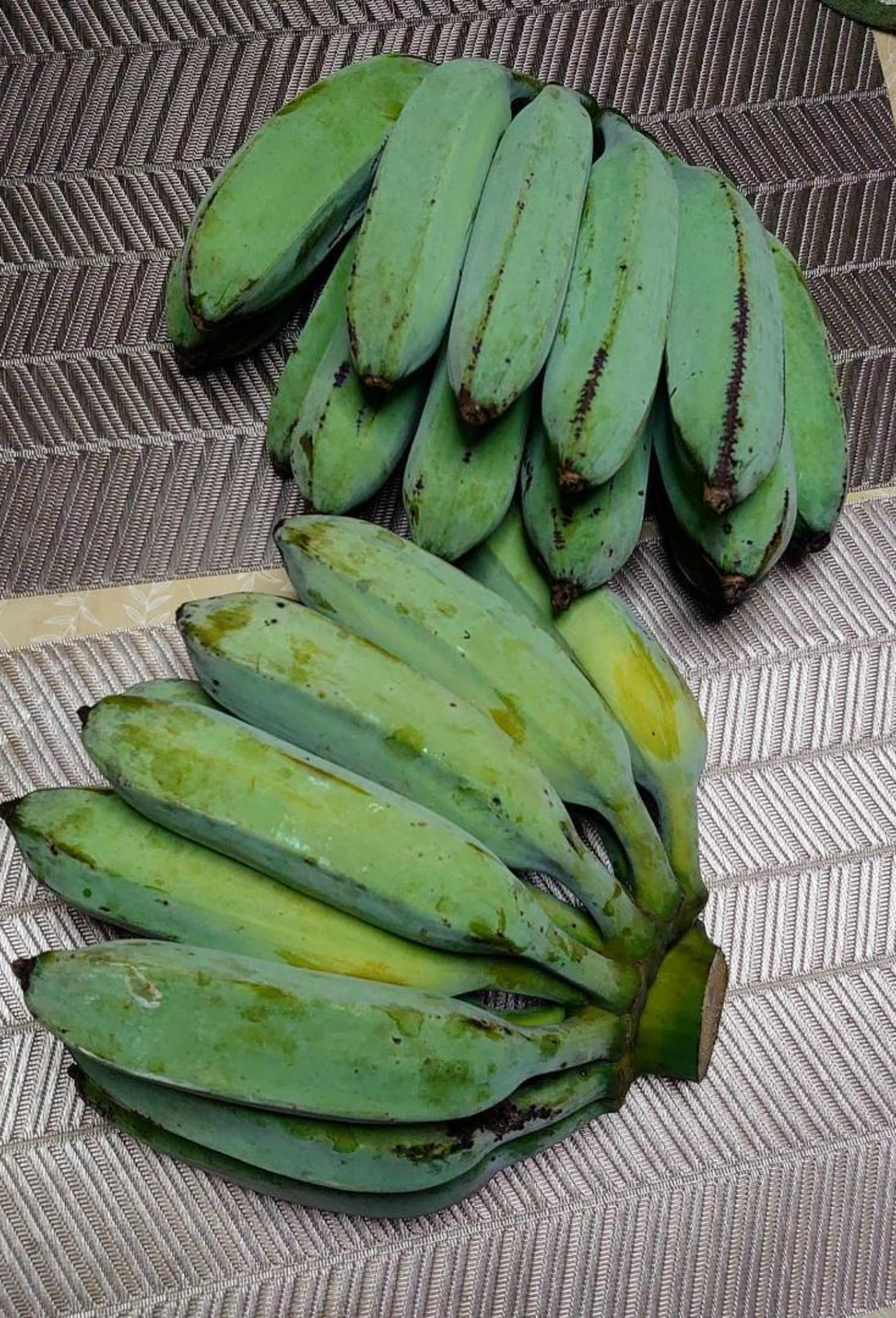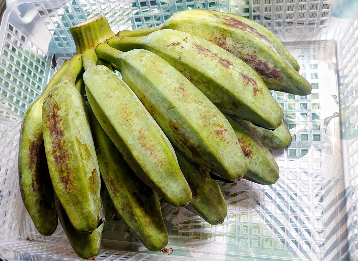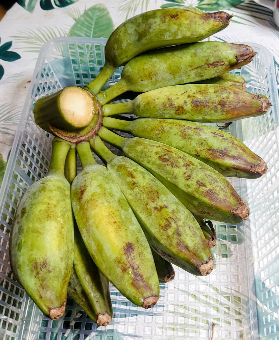 青い状態のものを常温の暖かい場所で数日保管されますと、黄色から黒っぽく追熟いたします。柔らかくなりましたら、フルーツのバナナとしてお召し上がりいただけます。